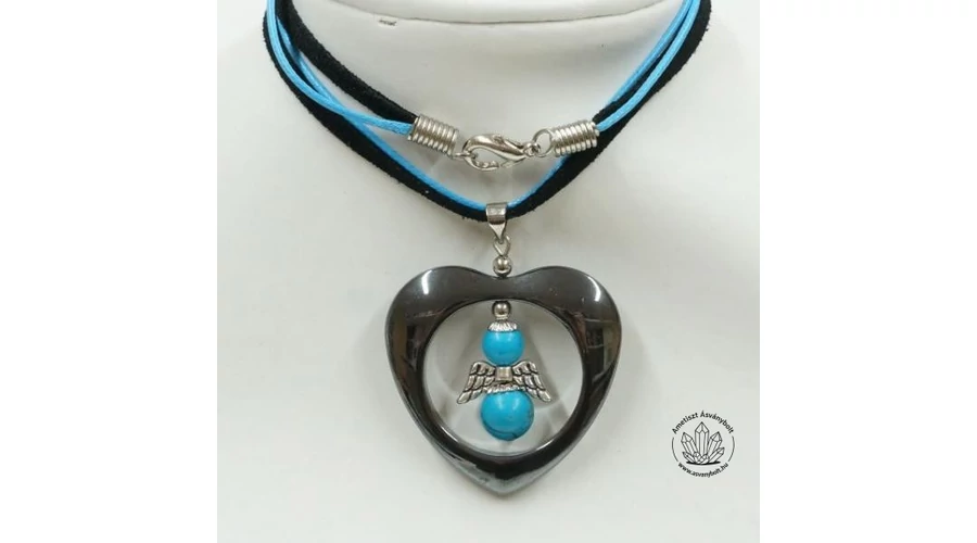 Az ékszer Hematit része egy 34 mm magas szív, ennek a felső részét átfúrták. Ebbe a furatba készítettünk Rekonstruált türkiz 6 és 8 mm-es golyóiból és antiallergén alkatrészekből álló angyalkát. A medált textilzsinórokból összeállított láncra fűztük, aminek a hossza alkatrészekkel együtt kb 43 cm.