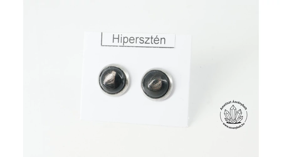 A Hipersztén érdekes ásvány, bizonyos andezit kőzetek tömegesen, de apró kristályokban tartalmazzák, viszonylag kevés lelőhelyen tömeges, csiszolható méretű. Magnézium és vas tartalmú szilikát ásvány, minél több a vas benne, annál feketébb a színe. A csiszolatok felületén ezüstös lilás fényjelenséget figyelhetünk meg, általában parketta szerűen látszik a fényjelenség. A legjobb minőségű anyagból csiszolt kabosonokat kb. 8 mm-es kör méretben tudjuk felhasználni, vastagságuk kb. 4 mm. Ezeket ragasztottuk bele a peremes nemesacél alapba beszúrós fülinek. A füli hátuljára gumi harangot illesztettünk. A kövek színe természetes, a képen látott darabokhoz hasonlóakat tudunk küldeni.