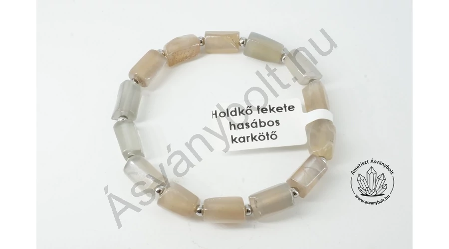 Új divat az ásványok kicsit természetes formáinak a viselése. A Holdkő fekete vagy szürkés színű kicsit természetes, kicsit csiszolt hasáb szerű darabjainak felülete nagyon egyszerűen csiszolt és fényesített darabok. Áttetsző szürkés barna hasábok, méretük kb. 7-8 mm vastag és 12-13 mm magas darabok, amiket gumi damilra fűztünk egy-egy nemesacél golyócskával elválasztva. A karkötő kb. 17 cm-es csuklóra van méretezve. A képen látható termékhez hasonló darabot tudunk küldeni.