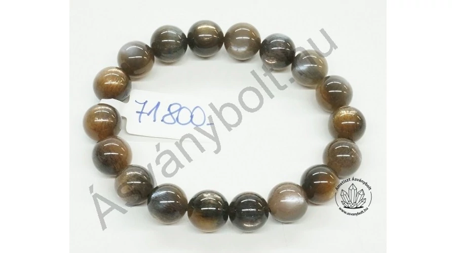 Ez az anyag valójában fekete – szürke Holdkő és aranyló barnás színű Napkő keveréke, új lelőhely anyaga Tanzániából. Különlegesség ! Látszik a golyókban a Holdkő ezüstös fénye és a Napkő aranyló csillogása. Az új anyagból minden darabkát feldolgoznak, ezért látványosan csak a nagyobb golyók vagy egyéb csiszolatok kerülnek forgalomba. A karkötőre fűzött golyók mérete 11 – 11,5 mm, az anyagot duplasoros gumira fűzték, a karkötő belső átmérője kb. 16 cm.