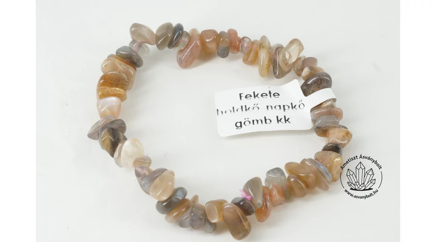 A valódi Holdkő általában fehér vagy sárgás árnyalatú, ritkán bányásznak belőlük zöld, aranysárga, fekete színeket. A fekete holdkő napkő lelőhelye Tanzánia, itt vegyesen található az egymásba nőtt Napkővel. Ebben a karkötőben vegyesen fekete – barna – aranysárga gömbölyített szemcséket fűztek fel dupla soros gumira. Ettől függően nagyon szép holdkő fényjátéka és fekete napkő aranyló csillogása van szinte mindegyik szemcsének a benne lévő hematit pikkelyektől. Az anyagból csiszolt gömbölyített szemeket kb. 17 cm méretű csuklóra fűzték.