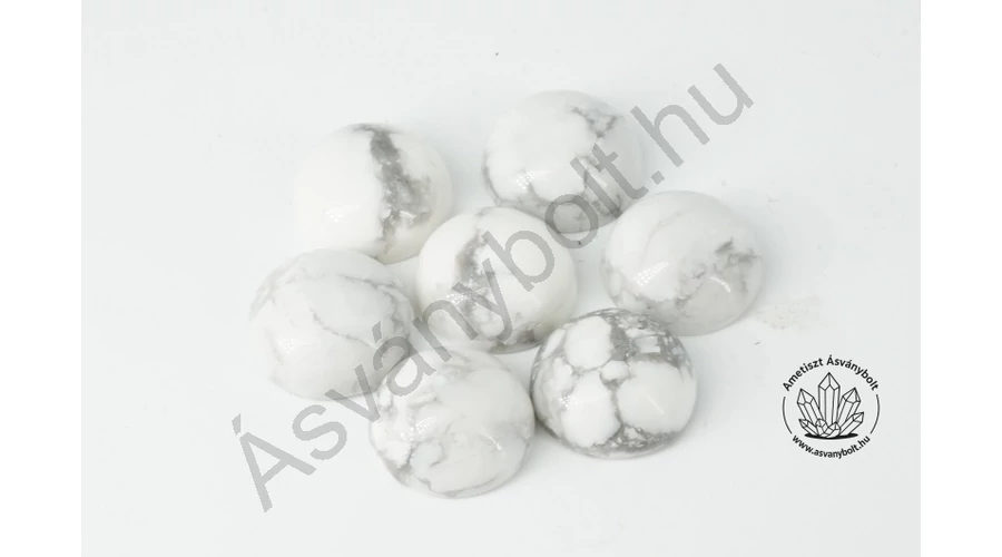 A Howlit fehér alapon szürke erezetes anyag mintája változatos. A belőle csiszolt kaboson mérete 12 mm, az alapján lapos, felülről enyhén domború, mindkét felületén fényes. Alkalmas foglalható, ragasztható és körbefonható ékszerek készítéséhez. Színe természetes, a képen látott darabokhoz hasonlóakat tudunk küldeni. Minimális vásárolható mennyiség 1 db x 400 Ft.
