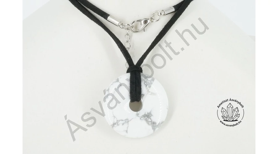 A Howlit érdekes kőzet, a fehér anyafban szürke sávok zárványok adnak neki mintát. Általánosan ismert ásvány és ékszerkő. A csiszolása jó minőségű esetleg a zárványok a kő felszínére nyílhatnak. Lelőhelyek : Kalifornia állam az USA-ban, Kanada. A fánkok mérete kb. 3 cm átmérőjű, vastagságuk kb. 6 mm, a furat mérete kb. 6 mm. A fánk medált textilbőr láncra fűztük, az alkatrészek nemesacélok, a lánc hossza kb. 45 cm + lánchosszabbító. A képen látható fánkokhoz hasonló mintájú darabokat tudunk küldeni.