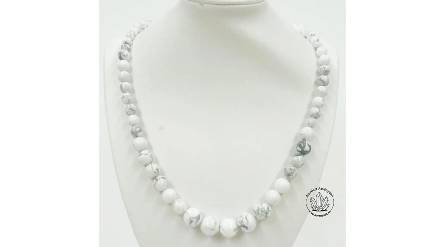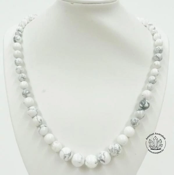A Howlit márványos fehér és szürke sávos csiszolt golyóiból fűztünk középre növekvő szemű láncot. Az anyaga a fehér sávozottság miatt látványos. A lánc végein 6 mm-es, a lánc közepén 12 mm-es a golyók mérete, a lánc végeit nemesacél alkatrészek zárják le. A lánc hossza kb 52 cm.