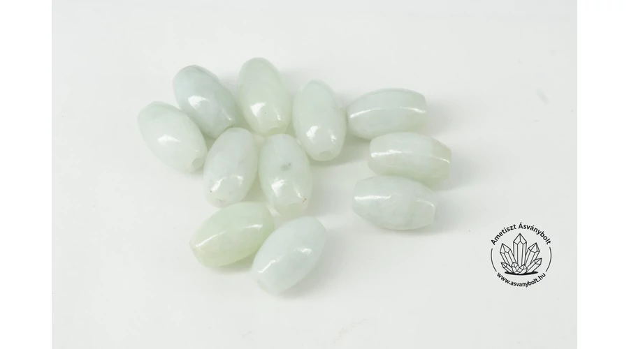 A Jade legjobb minőségű és legdrágább változatait Burmában bányásszák. A nem egységes színű, világoszöld változata általánosan ismert ásvány és ékszerkő. A csiszolása jó minőségű, áttetsző – átlátszatlan anyag esetleg felhősen zárványos. A rizs szemek mérete kb. 7 x 10 mm, 1,2 mm a furat mérete. A képen látható rizs szemekkel azonos színű darabokat tudunk küldeni.