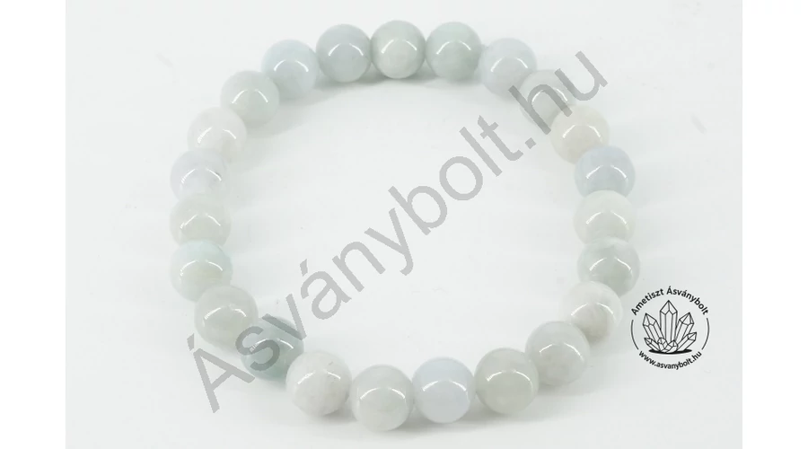 Az eddig megszokott kínai világoszöld Jadehoz képest extra minőségű anyagot bányásznak hagyományosan Burmában. Természetesen az áttetsző, halvány zöld esetleg lilás fehér ékszeranyagot csiszolják meg 8 mm-es golyóknak, a golyók felülete kicsit szabálytalan az ásvány kisebb keménysége miatt, az anyagban fekete zárványok láthatók. A golyókat lapos fűzőgumira fűztük kb. 17 cm méretű csuklónak megfelelően.