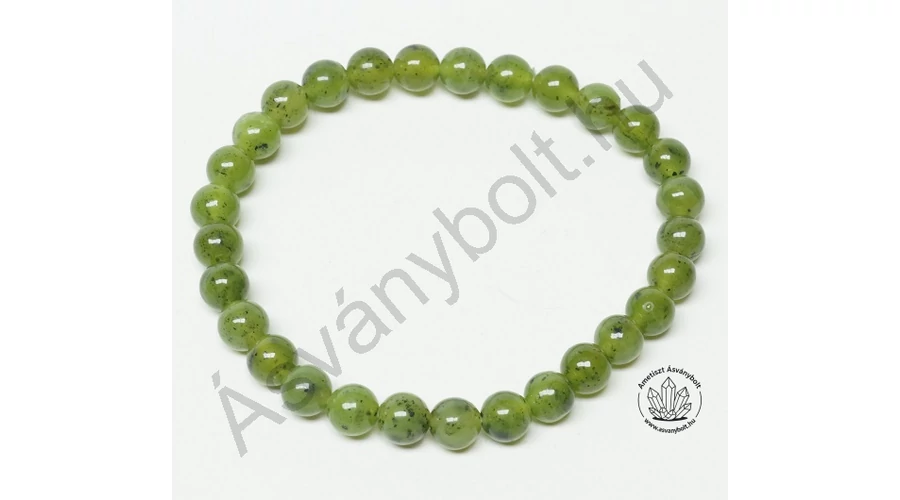 A Jade kanadai anyagából majdnem a legjobb minőségű anyagot szereztük be. A kicsit áttetsző és fekete pontokat tartalmazó anyag már második osztályú. A belőle csiszolt 6 mm-es golyók színe egységes, jól válogatott. A karkötő mérete duplasoros gumira fűzve kb. 18,5 cm.
