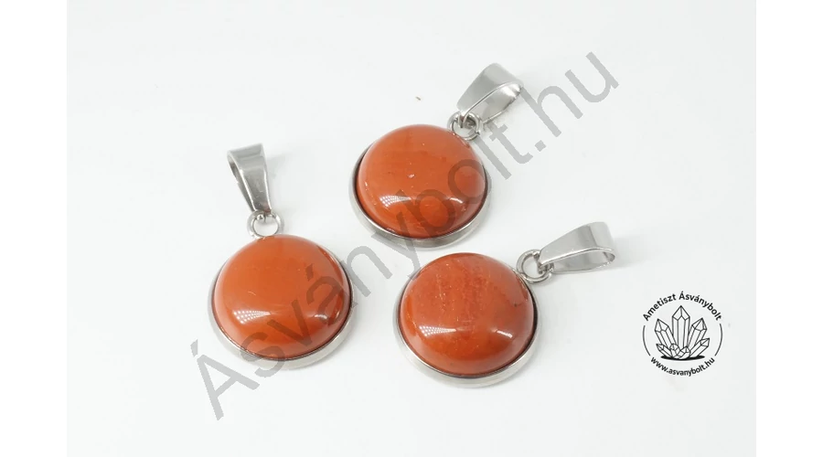 A Jáspis vörös változatának nagyon jó minőségű válogatott 14 mm-es kabosonjait ragasztottuk a nemesacél medál alapra. Két komponensű ragasztót használunk. Alulról teljesen zárt a foglalat. Egy pici színárnyalat eltérés lehet a kép és a küldött darabok között. A medálhoz nemesacél kilont illesztettünk. A medál teljes magassága kb. 26 mm. A medálhoz láncokat a Láncok, szálak, csomagolás termékcsoportból is lehet választani.
