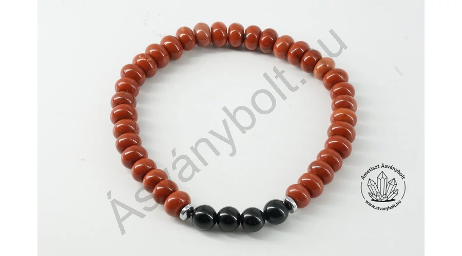 A népszerű ásványokból nem csak golyókat csiszolnak, hanem korongokat is. A vörös jáspis 4 x 6 mm-es korongjaihoz 6 mm-es Ónixot és 4 mm-es ezüstös színű Hematit korongokat használtunk fel egy szép karkötő elkészítéséhez. A karkötő anyagait gumi damilra fűztük, a karkötő mérete kb. 17 cm-es csuklóra jó méretű.