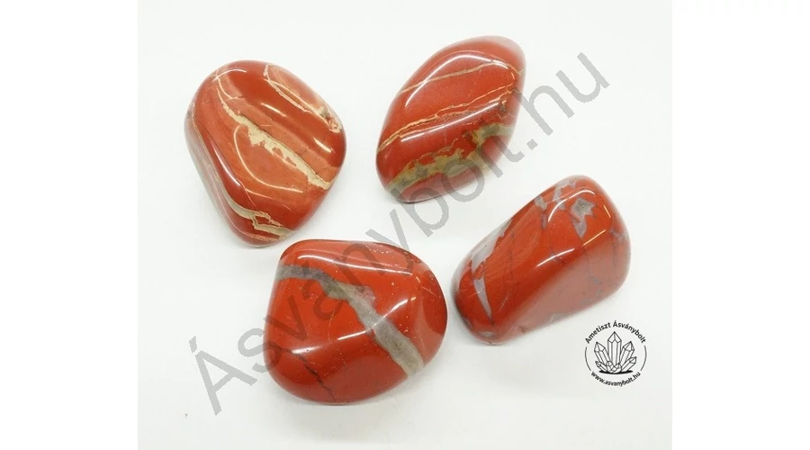 A Jáspis legismertebb színe a vörös, egyéb színű változatait más kiegészítő nevekkel nevezik. A vörös Jáspis szép mintázatú darabjaiban szürke és sárgásfehér Kalcedon is lehet, izgalmas rajzolatú marokkövek lesznek belőlük. A marokköveket szabálytalan formára csiszolták gépi csiszolással, ezért több felületi csiszolási hibájuk van. Méretük kb. 3 – 3,5 cm hosszúak.