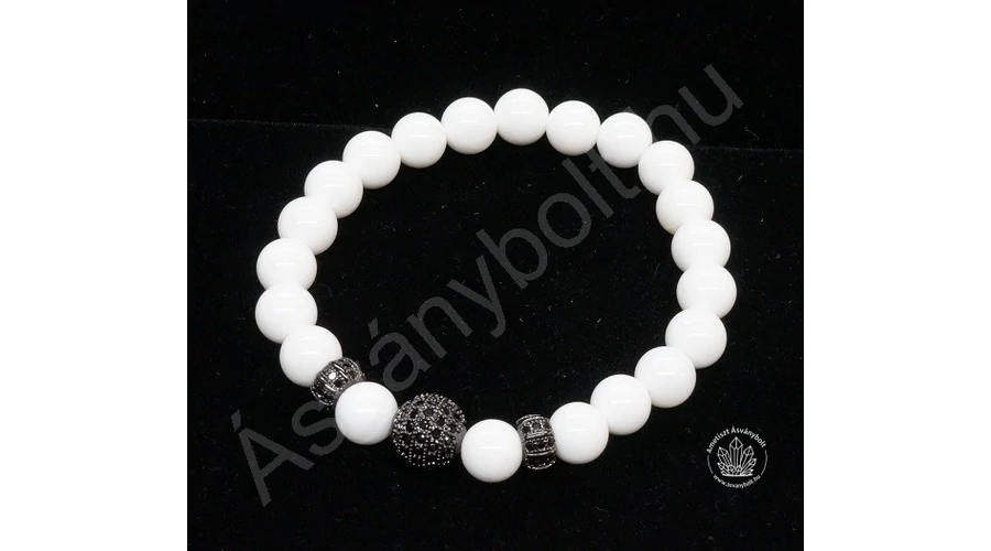 A fehér Kagylóhéjból csiszolt 8 mm-es golyókat a fekete köves mikro strassz alkatrészekkel fűztük össze látványos karkötőnek duplasoros gumira kb. 18,5 cm hosszban.
