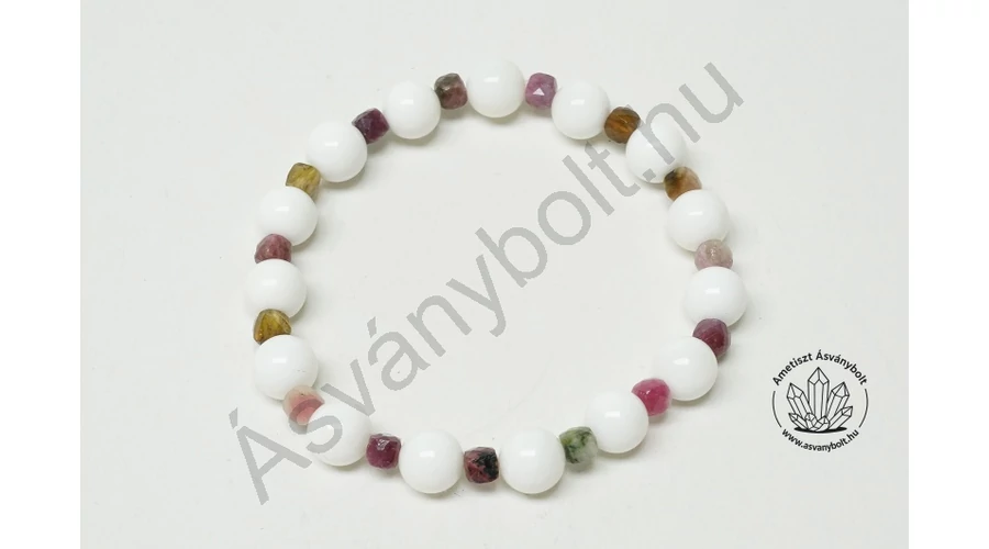 A népszerű fehér Kagylóhéj 8 mm-es golyóit egy teljesen új Turmalin színes fazettált 4 – 4,5 mm-es kocka formával kombináltuk. A kocka lapjain kicsit domborúan még pici lapokat csiszoltak, ettől különleges a forma. A karkötő anyagait dupla soros lapos gumira fűztük, a karkötő kb. 18 cm-es csukló méretnek felel meg. Különlegesen egyedi kombináció az új forma miatt.