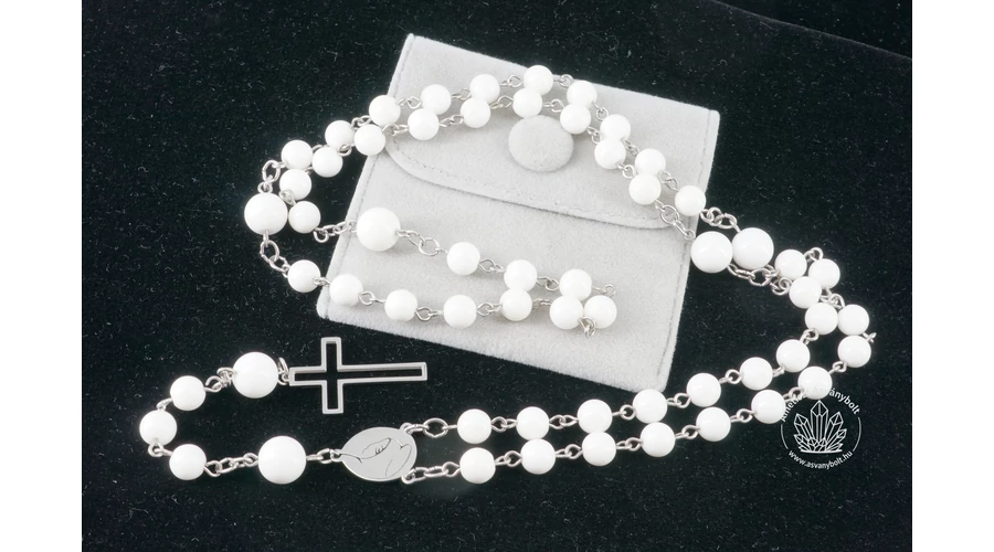 A Kagylóhéj fehér anyaga szép és olcsó ékszerkő, a belőle készült teljes rózsafüzér valódi extra minőségű 6 és 8 mm-es golyókból és nemesacél alkatrészekből van összeállítva teljes mértékben saját kézi munkával. Teljes hossza kb. 47 cm. Szürke színű kivül belül bársony felületű pattintós zárású tasakba csomagolva küldjük.