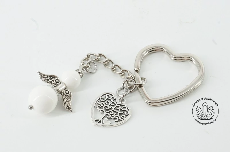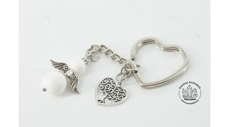 A fehér Kagylóhéj 12 mm-es és 8 mm-es golyóiból készítettünk angyalkát díszítő szerelékekkel, ezeket egy szív formájú kulcstartóra szerkesztettük egy életfa mintás szív medállal. A szív formájú kulcstartó mérete kb. 29 mm magas. A szerelékek réz ródium bevonatos fémek és a szív formájú kulcstartó vas alkatrész. A terméket kulcstartónak, táskadísznek is lehet használni.