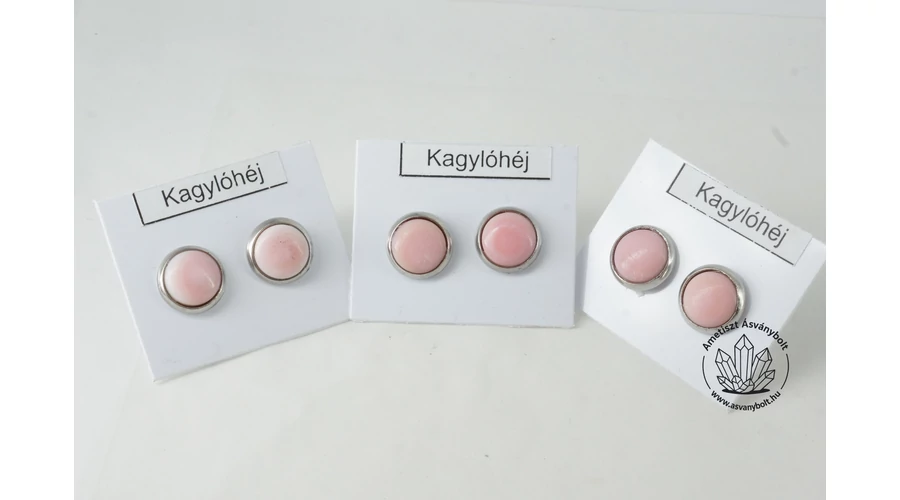 A ritkán beszerezhető karibi rózsaszínű csigaházból csiszolták a kb. 8 mm-es rózsaszín különböző árnyalataiban színes kabosonokat. Ezekből készítettünk nemesacél füli alapba beszúrós füliket. A képen látható színárnyalatokban tudjuk a füliket küldeni. A fülik tüskéjén gumi harang rögzíti a fülit.
