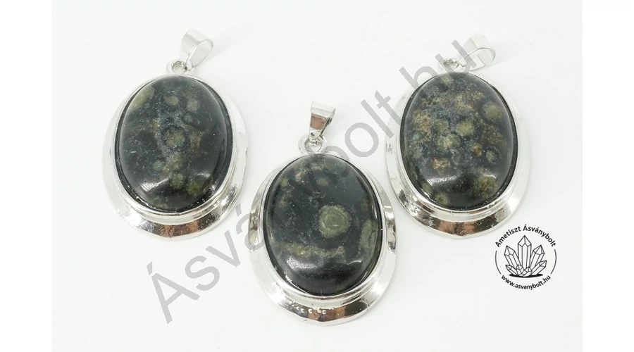 A Kambaba olcsó és dekoratív kőzet, Madagaszkár területén bányásszák, a zöld mindenféle színárnyalatában található. Szakvélemények szerint zöld színű Riolit kőzet. A sok helyen használt jáspis kiegészítő név ez esetben félrevezető, nincs köze a Kambabának a Jáspishoz, ez csak kiegészítés. A foltjaival lett népszerű ékszeranyag. A belőle csiszolt kaboson mérete 18 x 25 mm, az alapján lapos, felülről enyhén domború, mindkét felületén fényes. Színe természetes, a képen látott darabokhoz hasonlóakat tudunk küldeni. A követ rézből készült és ródium bevonatú, alulról nyitott foglalatba ragasztottuk. A medál teljes magassága kb. 41 mm.