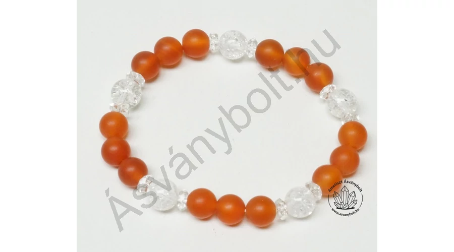 A Karneol matt 8 mm-es golyóiból fűztünk kétsoros gumi damilra karkötőt, amit Repesztett hegyikristály fazettált 8 mm-es golyóival és a Hegyikristály extra csiszolású fazettált tárcsáival díszítettünk. A karkötő kb. 18 cm-es csuklóra jó méretű.