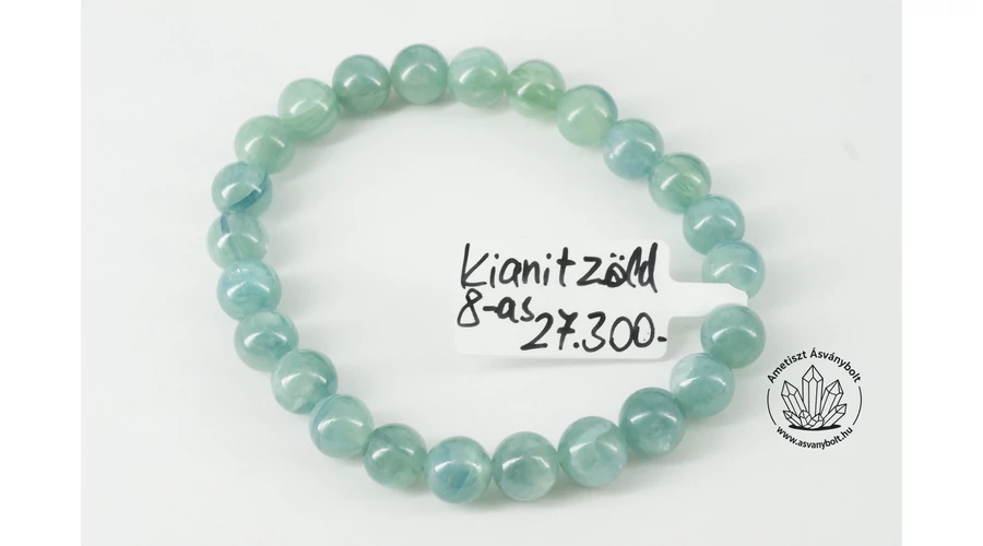 A kianit kék színben, jó minőségben, festés és ragasztás nélkül nehezen beszerezhető drágakő. A kék színű kianitnál jóval ritkább és esetleg drágább a zöld, zöldeskék színű kianit, amiből áttetsző – átlátszó anyagot sikerült beszereznem. A golyók anyagában jól látszanak a kékeszöld, zöld rétegek, ezek természetes színek. A karkötő golyói kb. 7,5 – 8 mm méretűek, emiatt 8 mm-es névvel nevezem, a karkötő egy kb. 16 cm-es csuklóra megfelelő méret. A golyókat gumi damilra fűztük.