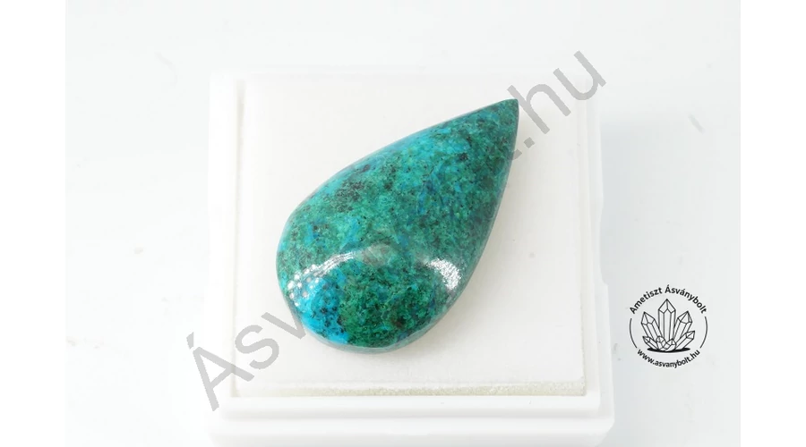 A Krizokolla legjobb és legszebb minőségű anyagát Peruban bányásszák. Az ottani nyersanyag jellemzően élénk kék, kísérő ásványai a zöld malachit, a vöröses fekete színű kuprit. A csiszolt kő magassága kb. 32,5 mm, szélessége kb. 18,5 mm, vastagsága kb. 7,5 mm. A csiszolat felül domború, alul lapos, mindenütt fényezett darab.