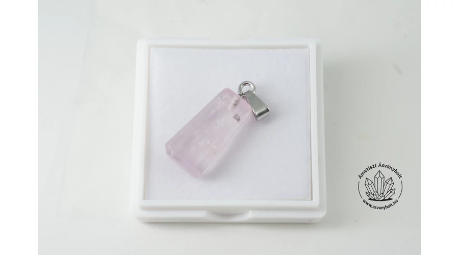 A Kunzit kristály formájú csiszolt felületű medáljai a legjobb minőségben, átlátszó és valódi halvány lilásrózsaszín változatban ritkák és drágák. A csiszolt formákat alaposan válogatva saját műhelyünkben fúrtuk és nemesacél menetes csappal ragasztottuk medálnak. A ragasztó két komponensből kevert műgyanta alapú ragasztó. A medálban természetes zárványok és hasadások láthatók, a kunzit magassága kb. 19 mm, a medál teljes magassága kb. 30 mm. A képen látható medált 4 cm x 4 cm-es dísz dobozkában küldjük.