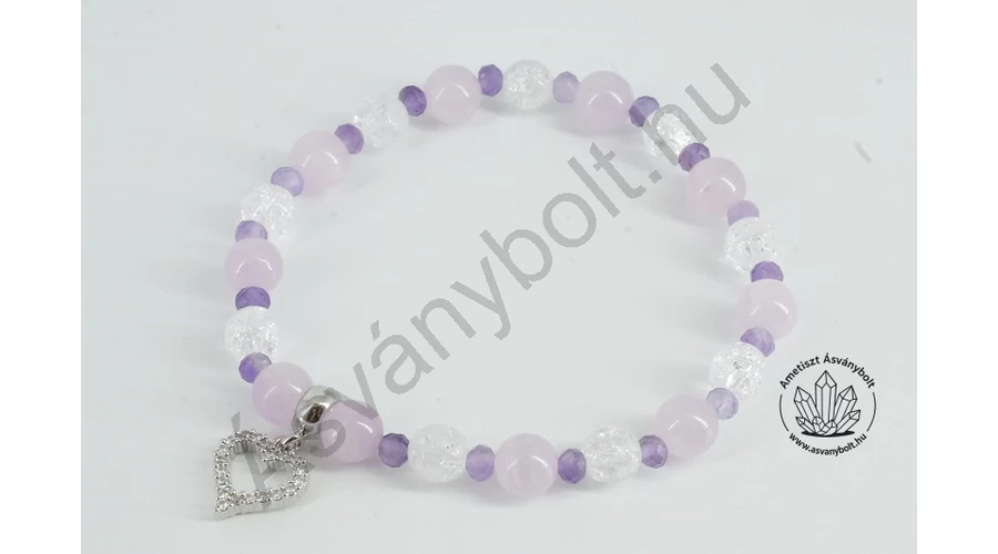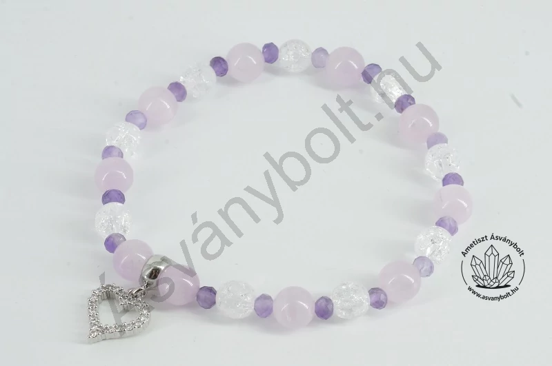 A Kunzit sötét lilás rózsaszín, áttetsző 6 – 6,5 mm-es golyóit váltogatva fűztük az Ametiszt fazettált 3 x 4 mm-es tárcsáival és a Repesztett hegyikristály fazettált 6-os golyóival. A karkötőbe egy különleges strasszos lyukas szív függőt szerkesztettünk. Az alkotókat gumi damilra fűztük kb. 17 cm méretű csuklónak megfelelően.