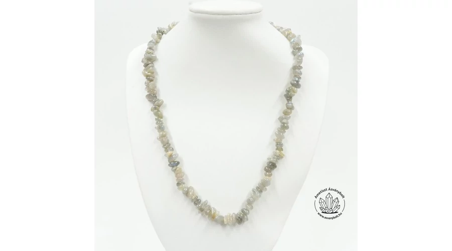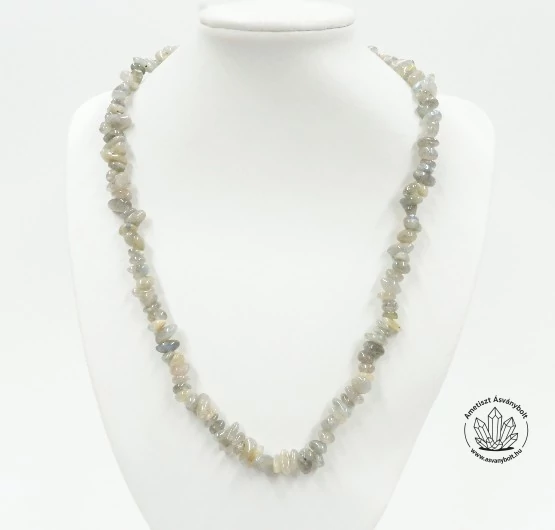 A Labradorit féldrágakő minden darabját gömbölyűre csiszolják, hogy kényelmesen viselhető legyen. Ez egy kicsit drágábban vásárolható ékszeranyag. A szemek mérete 0,5 és 1 cm közötti, damilra vannak fűzve, a lánc végén nemesacél fémalkatrészek vannak. A lánc hossza kapoccsal együtt kb 53 cm.