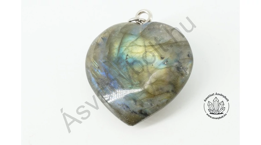 A drágakövek és ritkább féldrágakövek anyagából egy kicsit szabálytalan szív formákat csiszoltak és a legjobb minőségű darabokat megfúrtuk és acél csappal medálokat készítettünk. Ezek a kövek különleges fajtájuk és nehéz megmunkálásuk miatt drágábbak az egyszerű fajtáknál, különleges elkészítésükkel tartós ékszerek lettek. A Labradorit drágakő medál anyaga természetes színű, mindkét oldalán domborúra van csiszolva, belsejében fekete zárványok és repedések láthatók. A darab aranysárga - kékeszöld színben pompázik. A megrendelést az 50 x 50 mm-es dobozkában postázzuk.