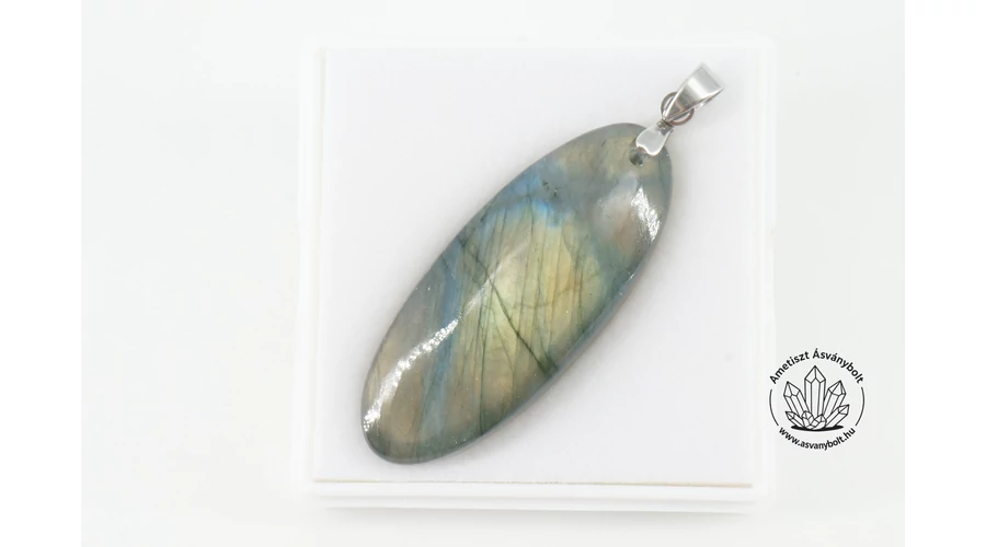 A Labradorit mindenféle gyönyörű színjátékával kedvelt drágakő. Ez az ovális medál saját csiszolású darab, a fúrást és a nemesacél szereléket is a műhelyünk készítette. Szemből enyhén domború kő, hát oldalon lapos. A Labradorit drágakő anyaga természetes színű, a darab jellemző színe a sárgászöld, sárga, kevés kék érrel. A mérete kb. 54 x 17,5 mm. A megrendelést a 50 x 50 mm-es ékszer dobozkában postázzuk.