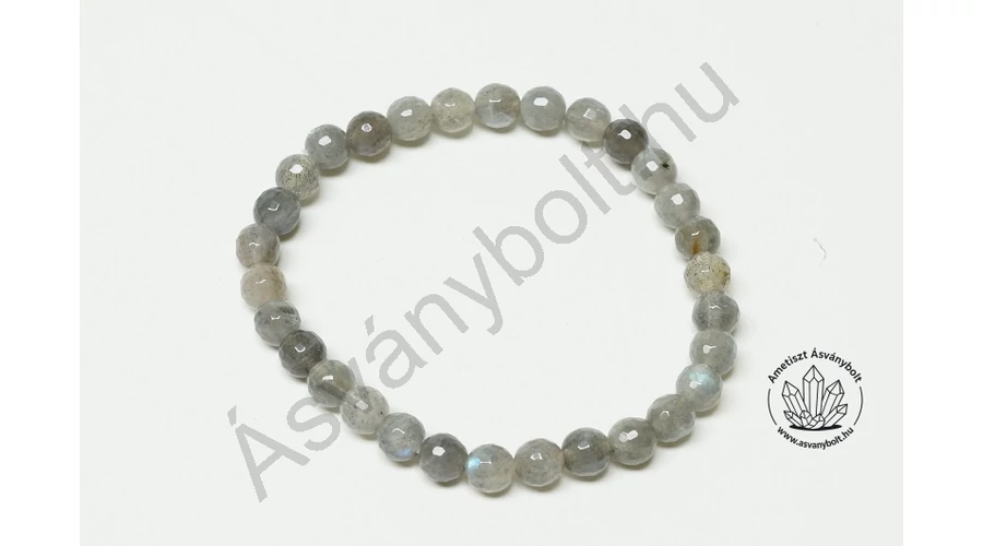 A Labradorit 6 – 6,5 mm-es fazettált golyócskák felületén mindenütt szép színes fényjátékot lehet megfigyelni. Némelyik golyó átlátszó – áttetsző, különleges minőségű. Az anyagot kb. 18,5 cm hosszban duplasoros gumira fűztük.
