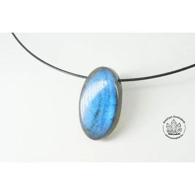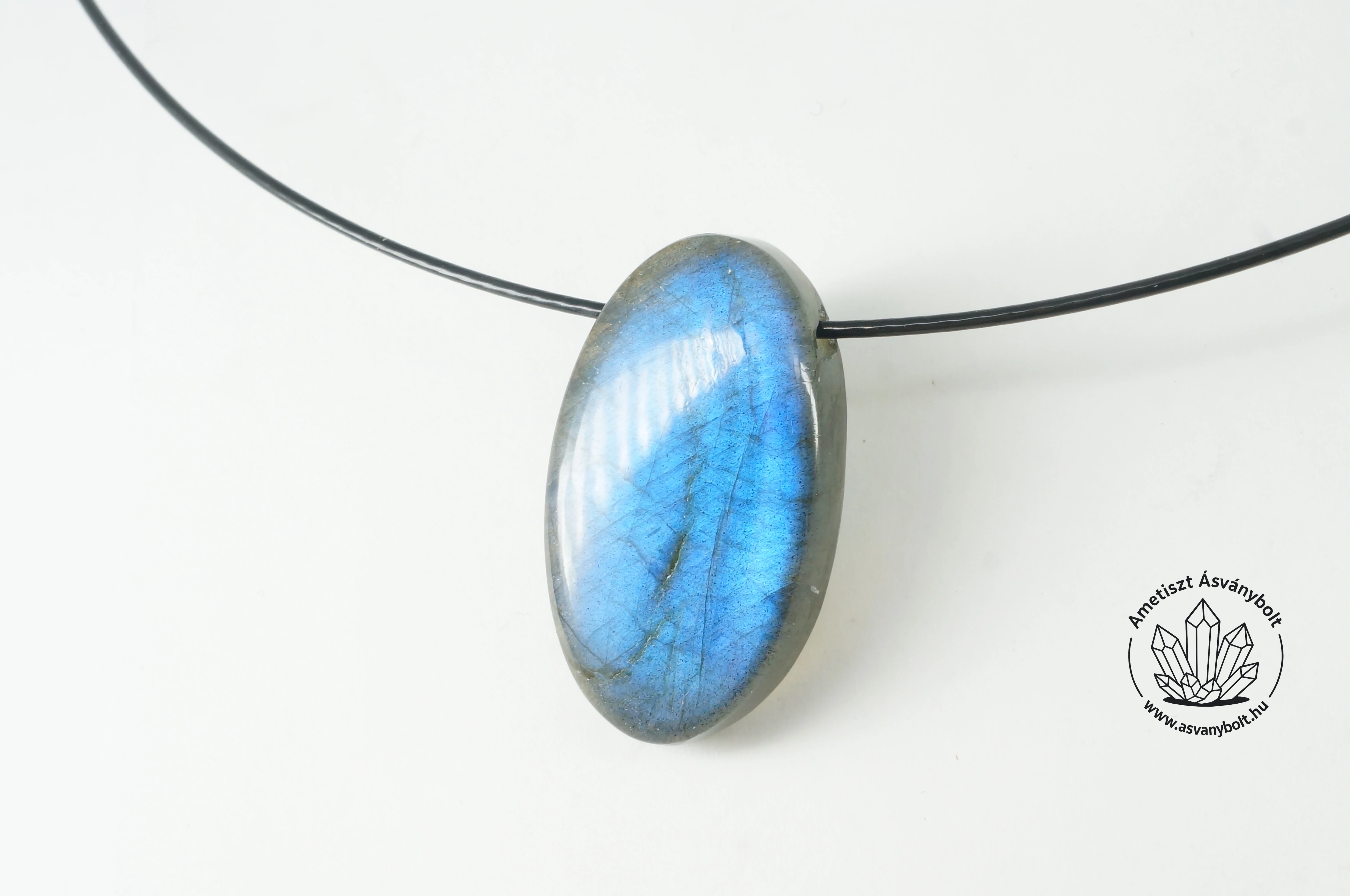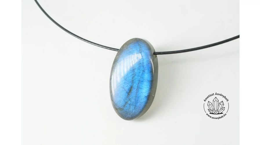 A Labradorit mindenféle gyönyörű színjátékával kedvelt drágakő. Ez az ovális medál saját csiszolás, de apróbb csiszolási hibák láthatók rajta, a fúrást és a fekete bevonatos sodrony láncot szintén műhelyünk készítette. A sodrony lánc hossza kb. 45 cm. Szemből enyhén domború kő, hát oldalon lapos. A Labradorit drágakő anyaga természetes színű, a darab egységesen tengerkék színű. A medál mérete kb. 29 x 17 mm. A megrendelést bársony ékszer tasakban postázzuk.