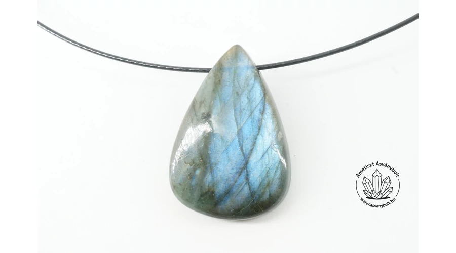 A Labradorit mindenféle gyönyörű színjátékával kedvelt drágakő. Ez a csepp medál indiai csiszolók munkája, emiatt apróbb csiszolási hibák láthatók rajta, a fúrást és a fekete bevonatos sodrony láncot a műhelyünk készítette. A sodrony lánc hossza kb. 45 cm. Szemből enyhén domború kő, hát oldalon lapos. A Labradorit drágakő anyaga természetes színű, a darab jellemző színe az acélos kék. A medál mérete kb. 33 x 23 mm. A megrendelést bársony ékszer tasakban postázzuk.