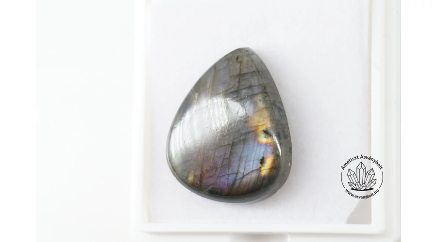A Labradorit mindenféle gyönyörű színjátékával kedvelt drágakő. Különleges és drágán kapható szín a lilás-ibolyás labradorit. Az anyaga Madagaszkárról származik. Ez a csepp kaboson egy indiai műhelyben készült. Szemből enyhén domború kő, hát oldalon lapos. A Labradorit drágakő anyaga természetes színű, a darab jellemző színe a lilás-ibolyás szürkéskék narancsos szín. A mérete kb. 24 x 20 mm, vastagsága kb. 6 mm. A megrendelést 40 x 40 mm-es ékszer dobozkában postázzuk.