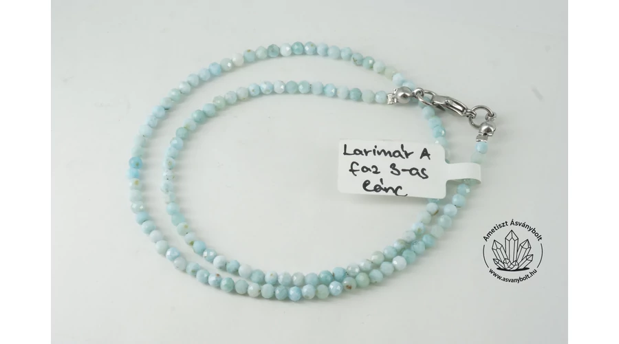 A Larimár egyetlen bányahelye Dominika, ahonnan a csiszolóüzemek vásárolnak nagyon drága nyersanyagot. A szép, kék – zöldes kék minőségű anyagból pici lapokkal csiszolt, fazettált 3 – 3,5 mm-es golyók készültek, kevés apró barna pontot találhatunk a szemeken. Az anyagot kb. 39.5 cm hosszban acél sodronyra fűztük, a lánc végeire nemesacél alkatrészeket szereltünk, így kb. 43 cm a teljes hossz.