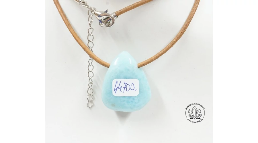 A Larimár drágakőből csiszolt szabálytalan formájú követ átfúrták és nyers színű bőrláncra rögzítettük. A medál szépségét így minden oldalról láthatjuk és a legjobb minőségű csiszolás ellenére apró felületi hibák és repedések találhatók rajta. A kő magassága kb. 29 mm, vastagsága kb 14 mm. A bőrlánc hossza kb. 47 cm, lánchosszabbítót is szereltünk rá, a lánc végeit antiallergén bevonatos fém alkatrészek zárják le.