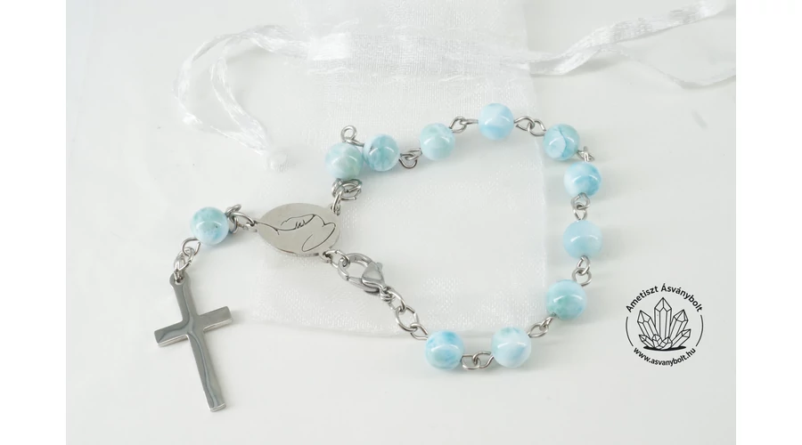 A Larimár értékes drágakő, a belőle készült tizedes rózsafüzér valódi extra minőségű 6 mm-es golyókból és nemesacél alkatrészekből van összeállítva teljes mértékben saját kézi munkával. Teljes hossza kb. 13 cm. Fehér színű organza tasakba csomagolva küldjük.