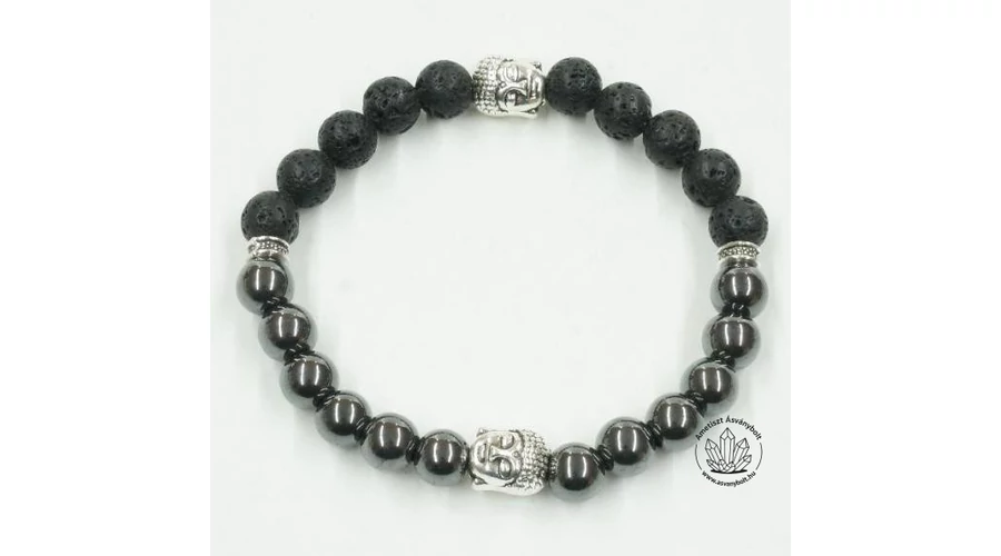 A Lávakő 8-as golyóiból a Hematit 8-as golyóival kombináltunk bölcs Buddha fejeket néhány fém gyűrűvel. A karkötő anyagát duplasoros gumira fűztük, a fém kellék antiallergén bevonatú. A karkötő mérete kb 20 cm.