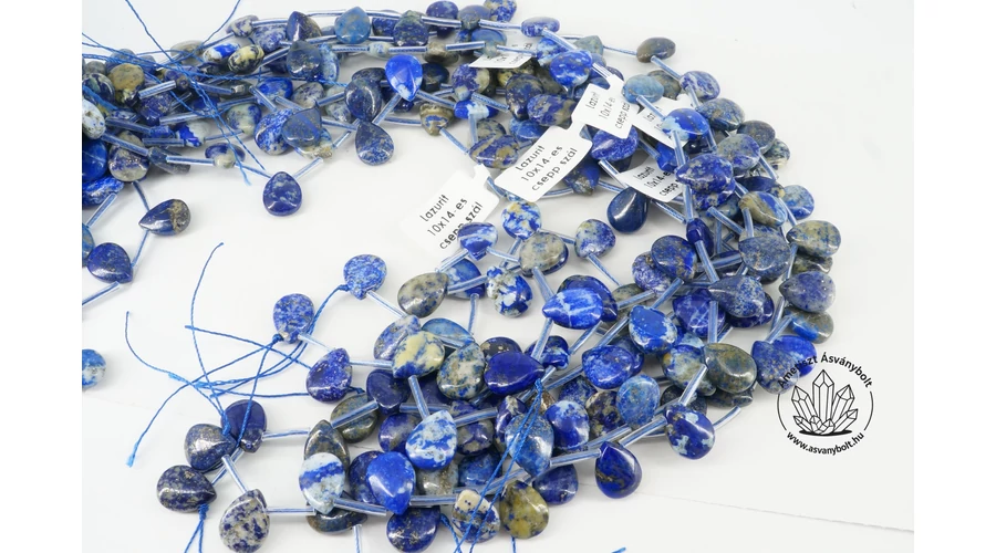 A jó minőségben ritkán beszerezhető és vásárolható különleges szépségű Lazurit ékszer anyagból csiszolt lapos csepp forma felső részén oldalról fúrtak lyukat a felhasználáshoz, a kövek magassága kb. 14 mm, szélessége kb. 10 mm, vastagsága kb. 4 - 5 mm, mindkét oldalán domború felületű. Az ásvány származása Afganisztán, a cseppekben fehér vagy sárgás Kalcit és Dolomit, aranyló pettyekben Pirit is látható. A cseppeket kis csövekkel fűzték zsinórra kb. 39 cm hosszban, a cseppekből 23 – 24 db van a szálon.