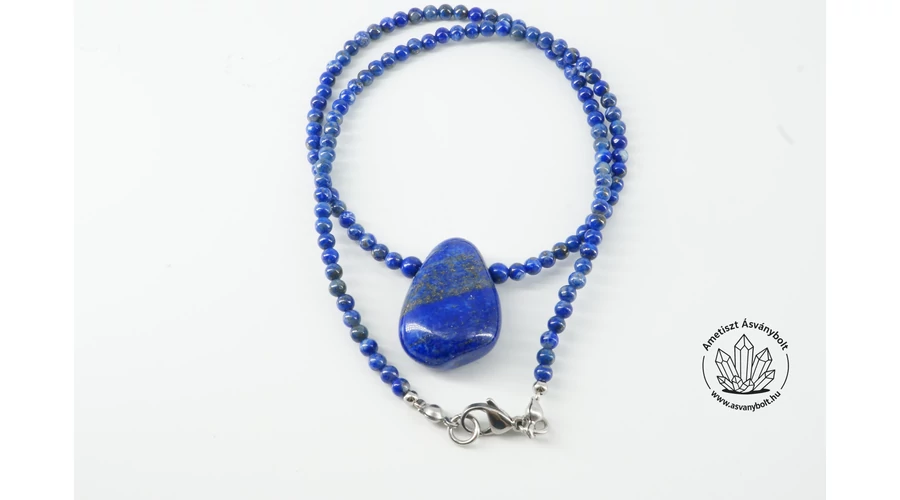 A Lazurit különleges és népszerű ásvány-drágakő. A csiszolt szabálytalan csepp medál sötétkék színével és pirit pontok csillogásával utánozhatatlan ékszer, a lánc anyaga sima 3 mm-es lazurit golyókból van összeállítva. A csepp medál saját műhelyünk csiszolása és fúrása, a lánc anyagait saját elképzelés alapján készítettük. A medál mérete kb. 27 x 19 mm, vastagsága 9,5 mm. A lánc anyagát acél sodronyra fűztük, a végeket nemesacél alkatrészek zárják le, a lánc teljes hossza kb. 45 cm.