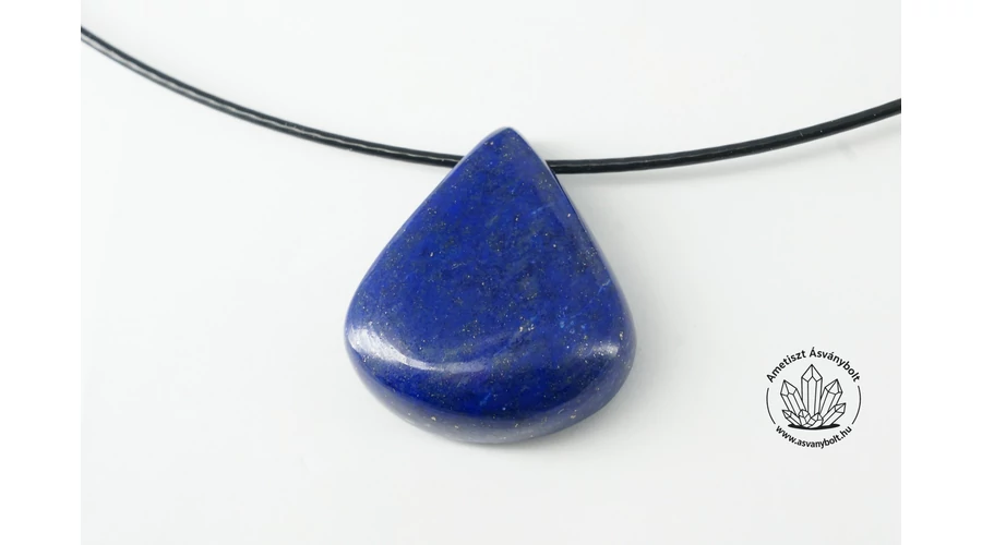 A Lazurit rendszeresen sötétkék ásvány Afganisztánból, elvétve van a medálokban fehér vagy sárga Kalcit vagy Dolomit és aranyló Pirit pontok. Ebből az extra minőségű anyagból csiszolt és fúrt medálok látványos darabok kék színük és csillogásuk miatt. Nem festett és nem lakkozott darabok! A képen látható kaboson medál saját műhelyünkben készült, a kaboson felső részének csiszolása extra minőségű, az alját simítottuk, kevésbé fényes. A fúrást és a lánc készítést szintén saját műhelyünkben készítettük. A sodrony lánc hossza kb. 45 cm. A medál mérete kb. 22 x 19,5 mm. A láncos medált bársony ékszer tasakban küldjük.