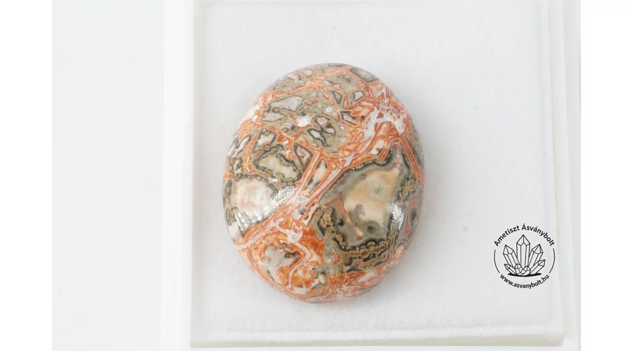A Leopárd jáspis olcsó és dekoratív riolit kőzet, Mexikó területén bányásszák, a sárga, vörös és szürke mindenféle színárnyalatában található. A sok helyen használt jáspis kiegészítő név ez esetben félrevezető, nincs köze a Leopárdnak a Jáspishoz, és nem jáspis, hanem riolit kőzet, ez csak kiegészítés. A belőle indiai műhelyekben csiszolt kabosonok felülről kiváló minőségűek, alulról csak simára csiszoltak, de nem fényezettek. A kaboson mérete kb. 24 x 19,5 mm. A világos barnás sárgás alapszínben gyönyörű mintákat adnak a gyűrűs foltok, ritkán, de apró anyaghibákat is láthatunk a felületeken. A képen bemutatott darabot 4 x 4 cm-es ékszerdobozban küldjük.