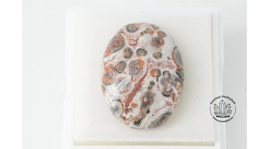 A Leopárd jáspis olcsó és dekoratív riolit kőzet, Mexikó területén bányásszák, a sárga, vörös és szürke mindenféle színárnyalatában található. A sok helyen használt jáspis kiegészítő név ez esetben félrevezető, nincs köze a Leopárdnak a Jáspishoz, és nem jáspis, hanem riolit kőzet, ez csak kiegészítés. A belőle indiai műhelyekben csiszolt kabosonok felülről kiváló minőségűek, alulról csak simára csiszoltak, de nem fényezettek. A kaboson mérete kb. 28 x 21 mm. A világos barnás sárgás alapszínben gyönyörű mintákat adnak a gyűrűs foltok, ritkán, de apró anyaghibákat is láthatunk a felületeken. A képen bemutatott darabot 4 x 4 cm-es ékszerdobozban küldjük.