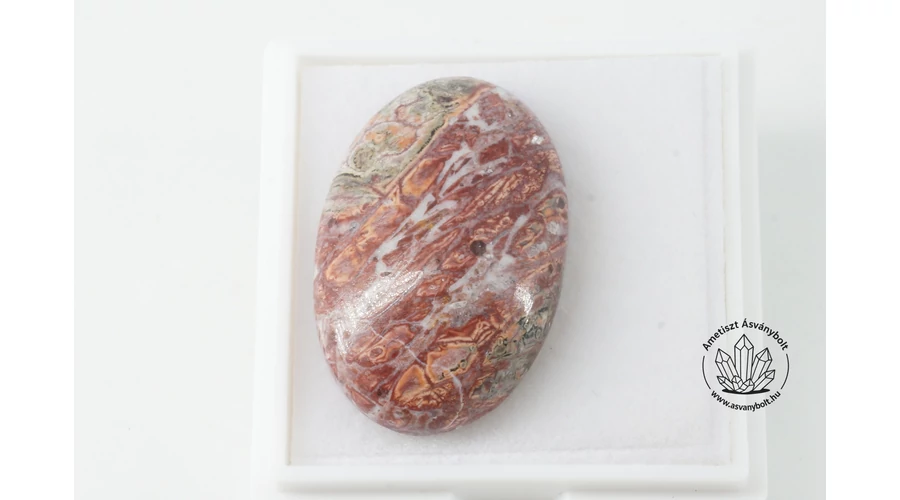 A Leopárd jáspis olcsó és dekoratív riolit kőzet, Mexikó területén bányásszák, a sárga, vörös és szürke mindenféle színárnyalatában található. A sok helyen használt jáspis kiegészítő név ez esetben félrevezető, nincs köze a Leopárdnak a Jáspishoz, és nem jáspis, hanem riolit kőzet, ez csak kiegészítés. A belőle indiai műhelyekben csiszolt kabosonok felülről kiváló minőségűek, alulról csak simára csiszoltak, de nem fényezettek. A kaboson mérete kb. 30,5 x 20,5 mm. A világos barnás sárgás alapszínben gyönyörű mintákat adnak a gyűrűs foltok, ritkán, de apró anyaghibákat is láthatunk a felületeken. A képen bemutatott darabot 4 x 4 cm-es ékszerdobozban küldjük.
