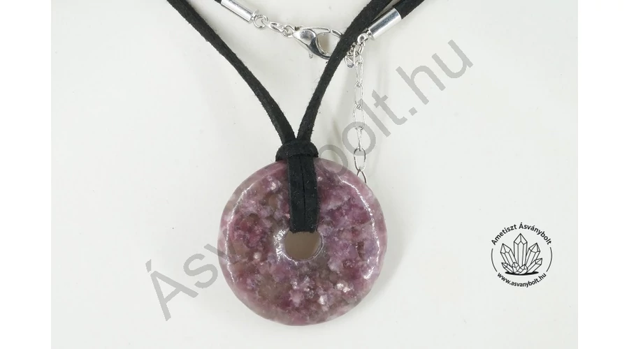 A természetes Lepidolit lelőhelyei Kalifornia az Usa-ból és Brazília. A valódi anyagban fehér vagy halványlila földpát ásványok is vannak, a Lepidolit Litium tartalmú csillám ásvány. Ezek csillognak a csiszolatok felületén. A fánkok mérete kb. 3 cm átmérőjű, vastagságuk kb. 6 mm, a furat mérete kb. 6 mm. A fánk medált textilbőr láncra fűztük, az alkatrészek nemesacélok, a lánc hossza kb. 45 cm + lánchosszabbító. A képen látható fánkokhoz hasonló mintájú darabokat tudunk küldeni.