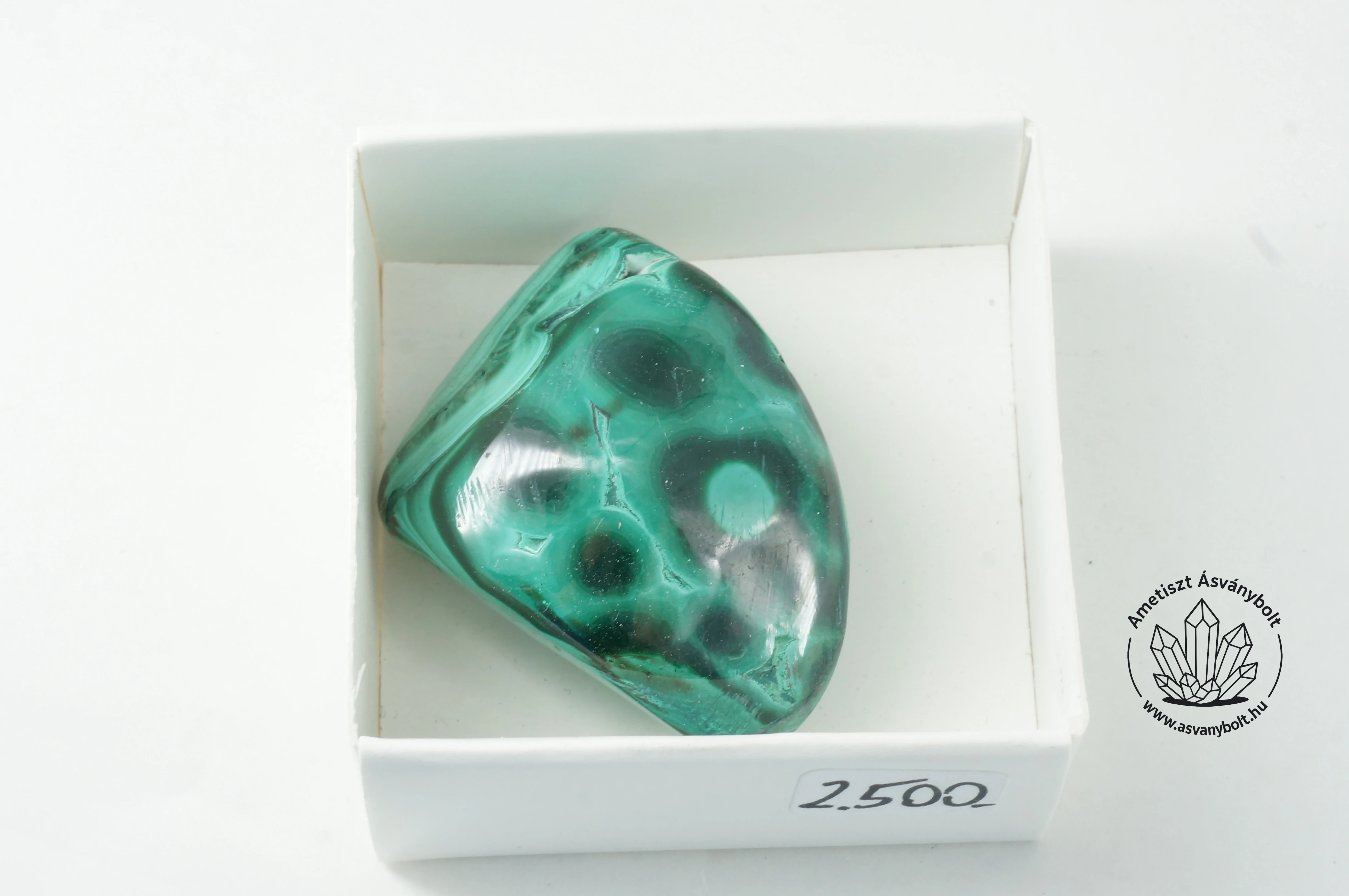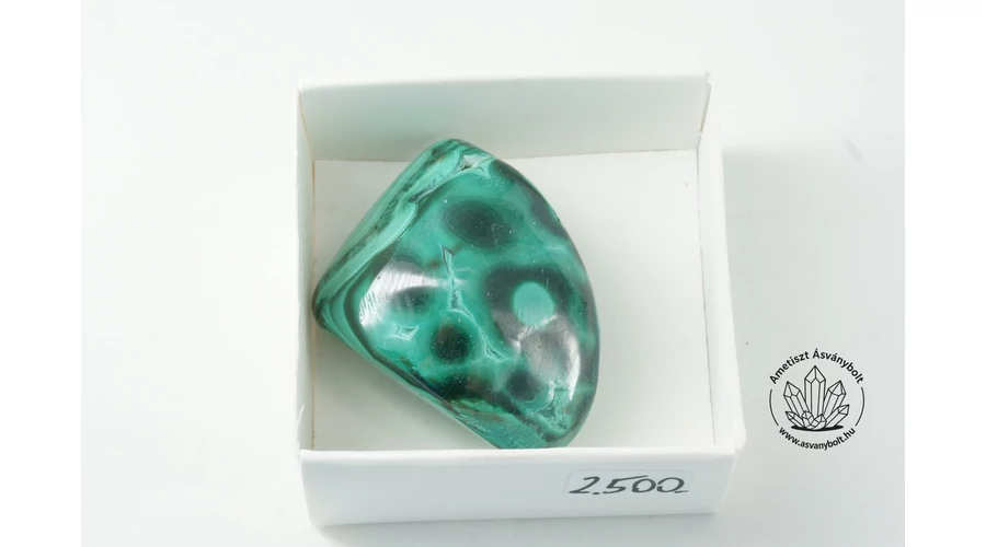 A Malachit már nagyon kevés helyen bányászott ásvány, a zambiai és kongói rézmező bányáiban még gyakori. A Malachit réteges képződése után a sötét és világos zöld rétegek váltakoznak, de soha nem fekete, mint az utánzatokban. A kitermelés után a hullámos gömbös szerkezeteket egyszerű eszközökkel megcsiszolják, hogy a Malachit váltakozó színű rétegei kibukkanjanak a felületből és a végeredmény egy hullámzó zöldes rajzolat. A bemutatott darabon is látszanak a gyenge minőségű csiszolás nyomai( karcos a felület), de már így is élvezhető a színek kontrasztja. A darab hossza kb. 32 mm, legnagyobb szélessége kb. 24 mm, legnagyobb vastagsága kb. 20 mm. A 4 x 4 cm-es papírdobozban postázzuk.
