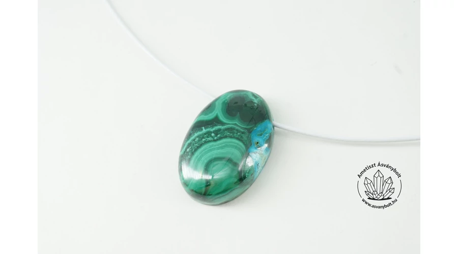 A Malachit különleges színe és rajzolata mindig érdekelte az ékszerkészítőket és csiszolókat. Amíg régi oroszországi uráli malachit bányák anyagából hatalmas dísztárgyakat csiszoltak, addig ma a drága közép afrikai bányák anyagából csak kis darabokat érdemes csiszolni. Akkor is csak az extra szépségű rajzolattal rendelkező darabokból. A kis méretű kabosonok csiszolásához a tömör és egyszerű rajzolatú nyersanyag jöhet szóba a tömeges csiszolás miatt. A medált saját műhelyemben csiszoltam extra minőségben, teteje és alja is kitűnő csiszolású, fényezésű. A medál fúrását és fehér sodrony láncra szerelését szintén saját műhelyünkben végeztük, a lánc hossza kb. 45 cm. A medál méretei kb. 26 x 17,5 mm. A láncos medált bársony ékszer tasakban küldjük.