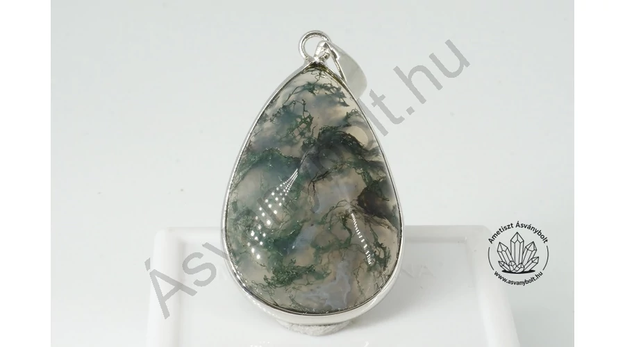 A Mohaachát féldrágakő medál alul lapos, felül domború csiszolású, a szegélyénél van körbe foglalva antiallergén ( vörösréz+ródium ) bevonatú fémfoglalattal. A foglalat alulról nyitott, így is jól látszik a kő gyönyörű rajzolata. A medálban a rajzolatot zöld agyagásványok okozzák, ezektől különleges és egyedi mohaszerű rajzolat látható , emellett az anyag áttetsző – átlátszó. Ezek a tulajdonságok egyértelműen a természetes anyag jegyei. A medál mérete jól viszonyítható a 50 x 50 mm-es dobozka méretéhez, a medál mérete kb. 43 x 21 mm. A medál rajzolata egyedi. A medált a dobozkában postázzuk.