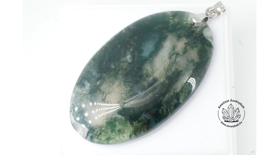 A Kalcedon ásvány család kedves tagja a szürke vagy fehér színű, áttetsző – átlátszó Mohaachát változó zöld vagy vörös színárnyalatú moha szerű zárványokkal, ami miatt nagyon népszerű. A leginkább zöld vagy néha vöröses zárványok moha, faág vagy erdő képét mintázzák, Klorit, Szeladonit esetleg Hematit miatt látványos. A belőle kitűnő minőségre csiszolt darabokból vékony kabosonokat készítenek, hogy jobban érvényesüljön a zárványok látványa. A bemutatott darabokat egy indiai csiszoló üzemben készítették kitűnő minőségű csiszolással, mindkét oldalán fényezett darabok! A képen látható medált saját műhelyünkben fúrtuk és nemesacél kapoccsal tettük viselhetővé. A medál mérete kb. 57 x 28,5 mm, az alapján lapos, felülről enyhén domború, mindkét felületén fényes. Vastagsága kb. 6 mm. Színe természetes, a darabot a 5 x 5 cm-es ékszerdobozban küldjük.