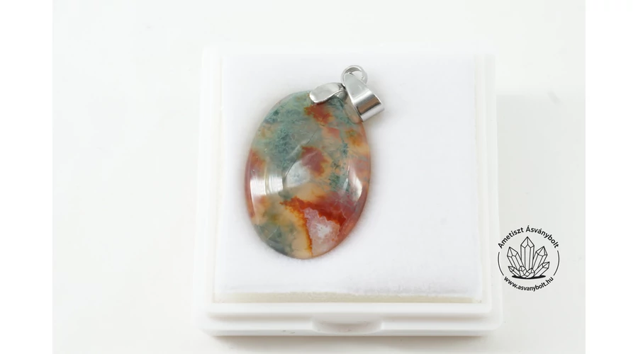 A Kalcedon ásvány család kedves tagja a szürke vagy fehér színű, áttetsző – átlátszó Kalcedon változó zöld és vagy vörös színárnyalatú moha szerű zárványokkal, ami miatt nagyon népszerű. A leginkább zöld vagy néha vöröses zárványok moha, faág vagy erdő képét mintázzák, Klorit, Szeladonit esetleg Hematit miatt látványos. A belőle kitűnő minőségre csiszolt darabokból vékony kabosonokat készítenek, hogy jobban érvényesüljön a zárványok látványa. A bemutatott darabok Indonéziából származnak, egy indonéz csiszoló üzemben készítették kitűnő minőségű csiszolással, mindkét oldalán fényezett darabok! A képen látható medálkő mérete kb. 23,5 x 17 mm, az alapján lapos, felülről enyhén domború, mindkét felületén fényes. Vastagsága kb. 5 mm. A medált saját műhelyben fúrtuk és alkatrészeztük nemesacél alkatrésszel, teljes magassága kb. 25 mm, a medált 40 x 40 mm-es ékszerdobozban postázzuk. Színe természetes, megismételhetetlen!