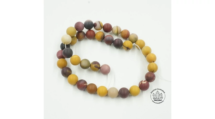 A termék kb 39 cm hosszú, a felfűző damilt mindkét végén csomó zárja le. A szálra fűzött golyók mérete 10 – 10,5 mm tehát a szálon legalább 36- 38 golyó van felfűzve. A szálat így alkatrészek nélkül lehet vásárolni, a terméket saját munkával kell bármilyen ékszernek elkészíteni. Hozzávaló alkatrészek az alkatrészek menüben találhatók.