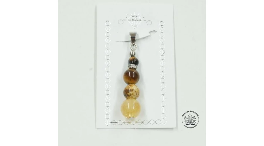 A napfonat csakra medál 4-6-8 mm-es golyókból van összefűzve, Tigrisszem Tájképjáspis és Citrin golyókból. A golyókat antiallergén fém alkatrészekkel szereltük össze medálnak, a medáltartó kártya 5,5 cm magas, a medál kb 3,5 cm, a terméket fóliatasakba csomagolva küldjük.